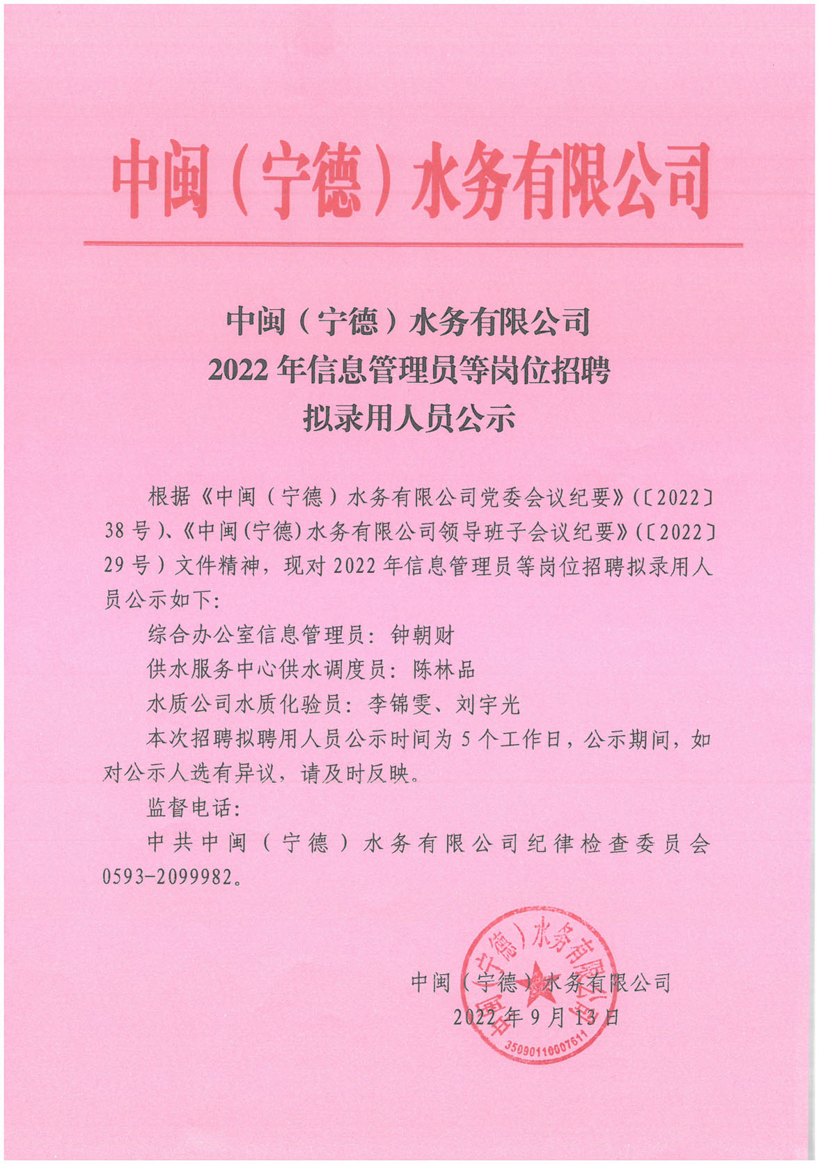 2022年信息管理員等崗位招聘擬錄用人員公示